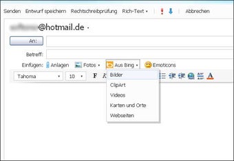 Windows Live Hotmail bietet eine recht intuitive Benutzeroberfläche für das Verfassen elektronischer Nachrichten. Die E-Mails versieht man per Knopfdruck mit Smileys, Links und verschiedenen Schriftarten. Fotos und Videos fügt man entweder aus dem eigenen Fundus oder über eine direkt Verknüpfung zur Suchmaschine Bing ein.